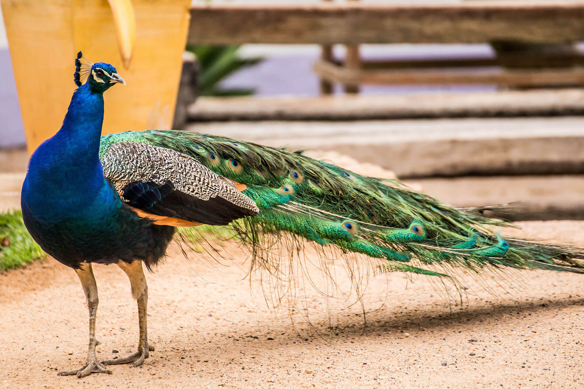 Peacocks are best known for their vivid plumage. Male peacocks have bright blue heads and necks, as well as tails of long, iridescent green, blue, and gold feathers with distinctive, eye-shaped tips. These feathers can either lay flat across their backs or be raised in a fan for courtship rituals. On the other hand, the much smaller females, or peahens, need to hide from predators rather than attract mates, so their plumage is a dull, mottled brown. Peacocks have strong, long legs with sharp spurs that allow them to run quickly and defend themselves.